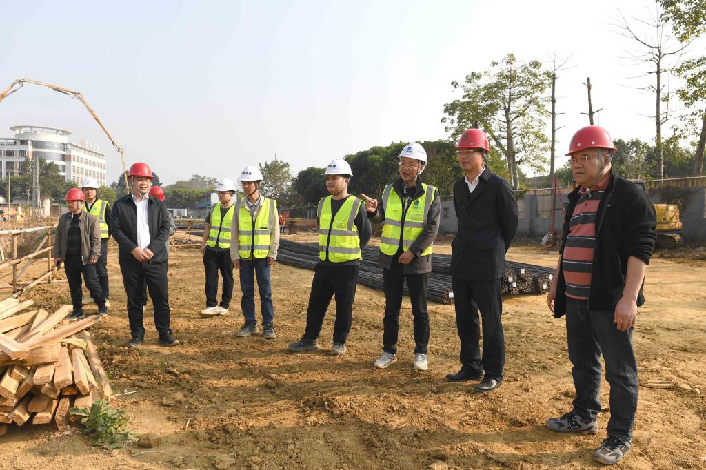学校党委书记冯昌信(右二)在新建学生宿舍楼项目施工现场